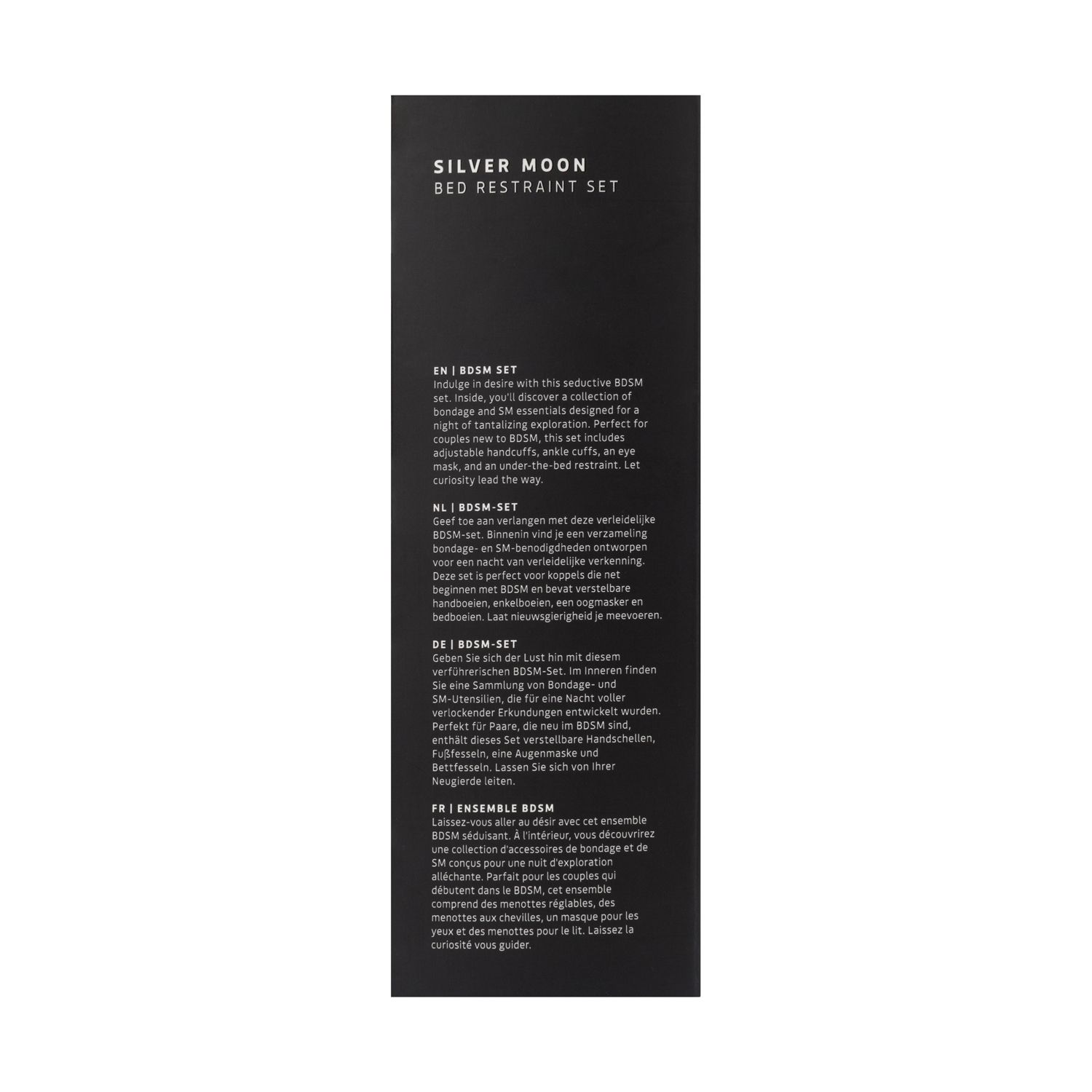 Silver Moon combineert visuele prikkeling met lichte beperking, waardoor aanrakingen intenser worden beleefd en spanning langzaam kan worden opgebouwd. De accessoires stimuleren een spel van overgave en controle, terwijl de focus blijft liggen op wederzijds plezier en communicatie. Dit maakt de set bijzonder geschikt voor koppels die hun eerste stappen willen zetten in een speelser intiem spel, maar ook voor wie variatie zoekt binnen een vertrouwde setting.
