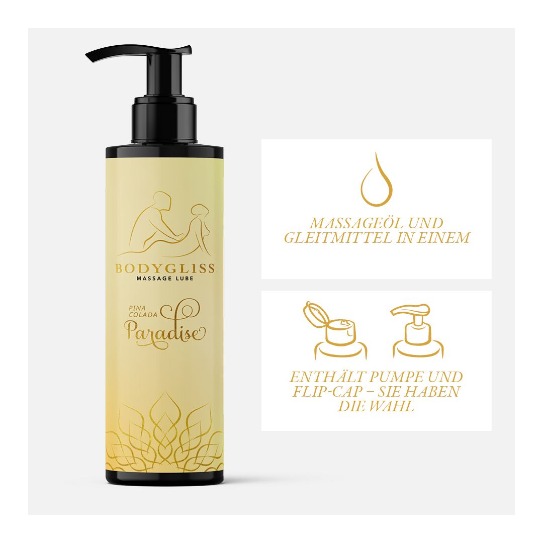 Geef elkaar een heerlijke massage met de producten uit de Massage Collection van BodyGliss. Deze massage glijmiddel kun je ook als glijmiddel gebruiken en is op siliconenbasis. De olie zit in een mooie flacon met handig pompsysteem en heeft een zijdezachte formule met huidverzorgende eigenschappen waaronder vitamine E. BodyGliss gebruikt de hoogwaardige pure variant dimethicone silicone olie in een hoog percentage wat een perfect glijdend vermogen geeft. De intense verschillende geuren geven de oliën ieder hun eigen unieke karakter en zorgen voor een ontspannend of opwekkend gevoel. De olie is veilig voor latex condooms.