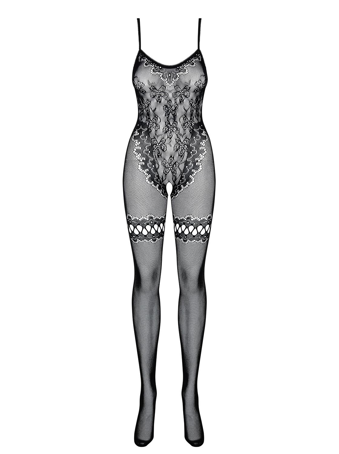 Dit catsuit heeft een open kruisje en doorzichtige stof. Je lichaam is bedekt en tegelijkertijd weer niet. Het bloemen motief zorgt voor een scheiding van de benen. Dit catsuit heeft verstelbare bandjes en is comfortabel om te dragen.