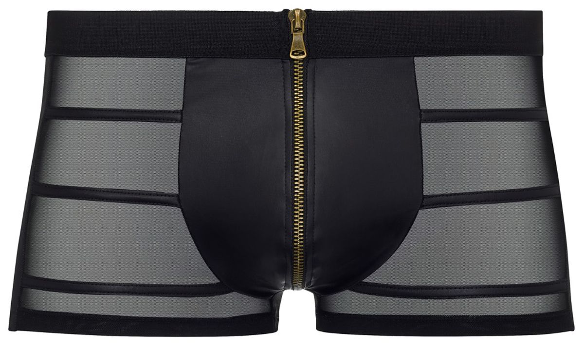 In deze sexy boxer weet je zeker dat je billen volledig tot hun recht komen. De zwarte boxer is gemaakt van doorschijnend materiaal en heeft een wetlook voorkant. Deze is voorzien van een rits met daarachter bescherming zodat het niet tegen het lichaam schuurt. Draag het met sexy kleding of gewoon zo en voel je klaar voor elk avontuur!